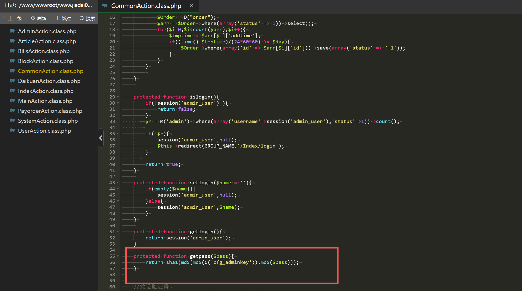 在网站目录/www/wwwroot/www.mtbtsdafda.com/APP/Modules/Systemlogined/Action看到文件LoginAction.class.php里面有处理密码的代码