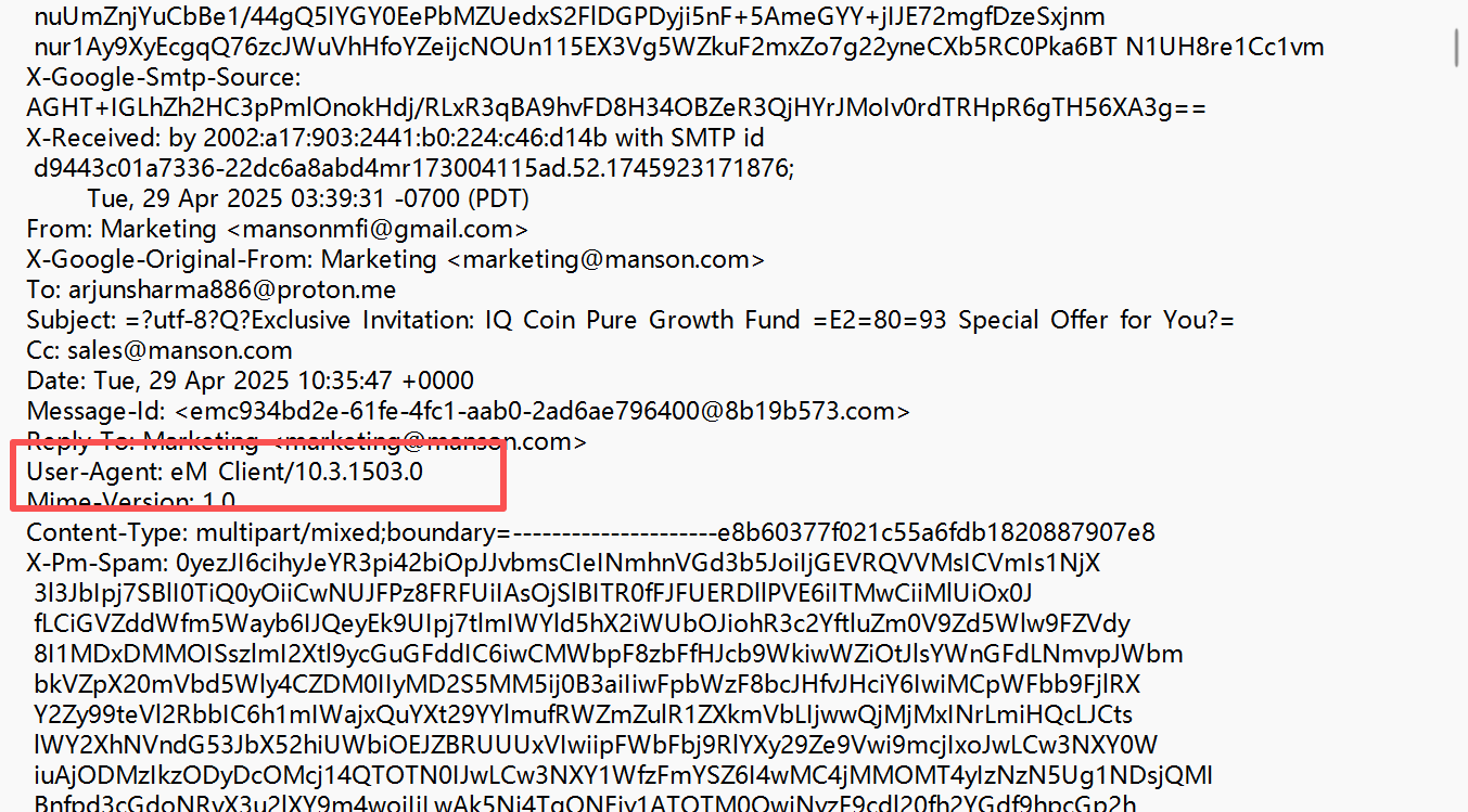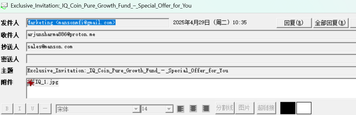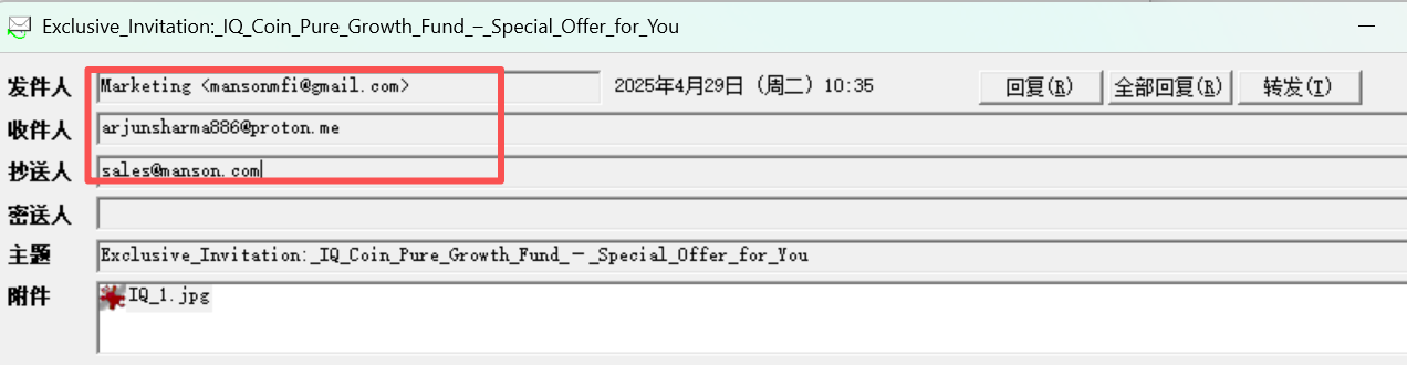 8 请分析"Exclusive Invitation_IQ Coin Pure Growth Fund – Special Offer for You 2025-04-29T18_35_47+08_00.eml"文件的邮件头信息, 以下哪项说法是正确的?