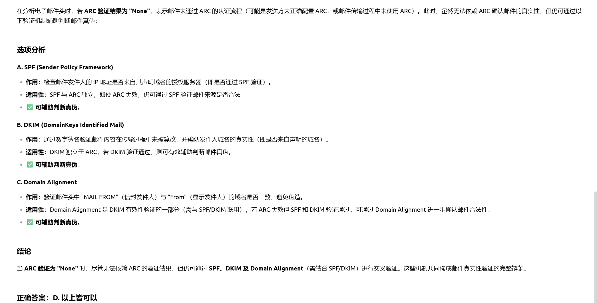 7 当你分析邮件头时发现认证接收链(Authenticated Received Chain, 简称 ARC)验证结果为"None"时, 则代表这封邮件没有进行 ARC 邮件验证. 在这情况下, 我们可以通过以下哪一个方式协助我们判断邮件的真伪