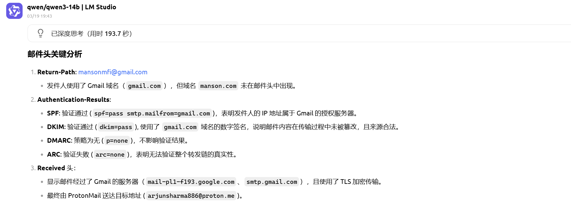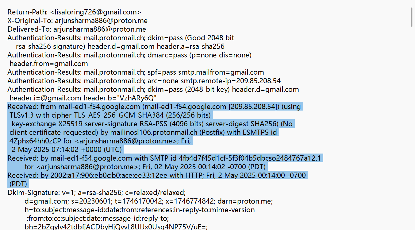 D. 邮件路由信息与域名引用证实该邮件经 Gmail 服务器发送邮件