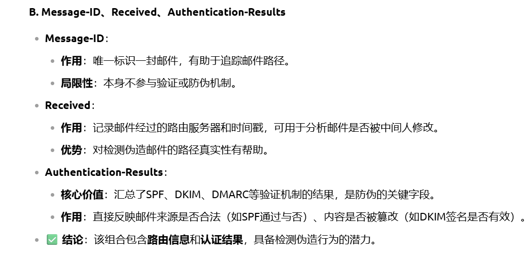 A. 发件人策略框架(Sender Policy Framework, 简称 SPF): 检查邮件是否来自其声称的域的授权服务器
