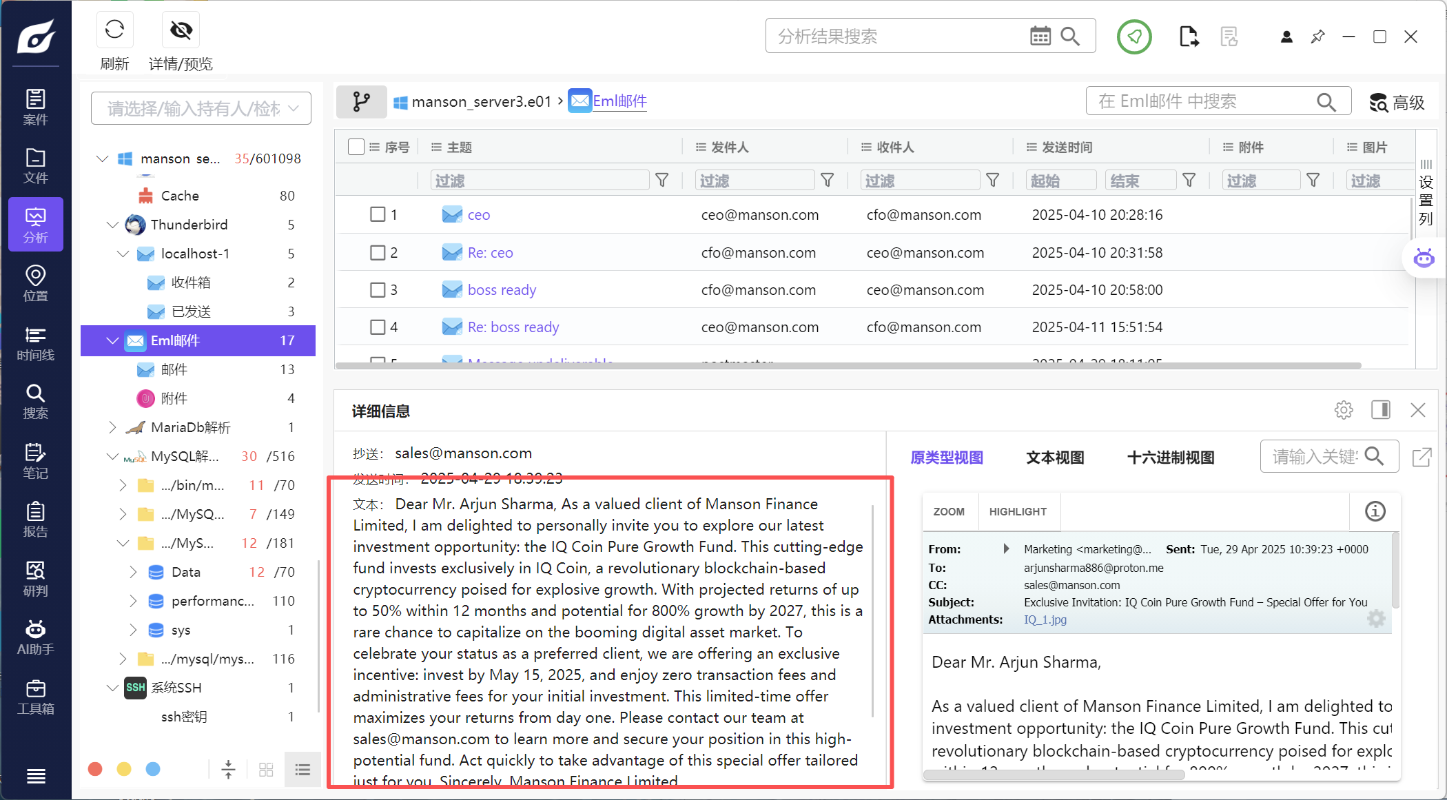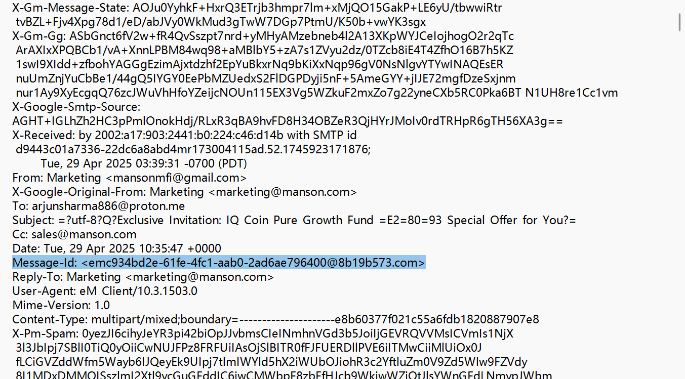 14 Exclusive Invitation_IQ Coin Pure Growth Fund – Special Offer for You 2025-04-29T18_35_47+08_00.eml 请检查此邮件的 Message-ID 与发件人地址关系, 并判断是否存在伪造嫌疑