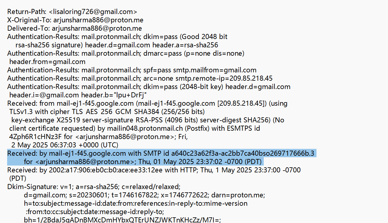 A. 邮件头中存在与 Gmail 官方信息匹配的字段,验证了转发身份的合法性