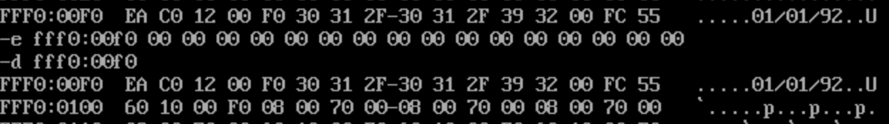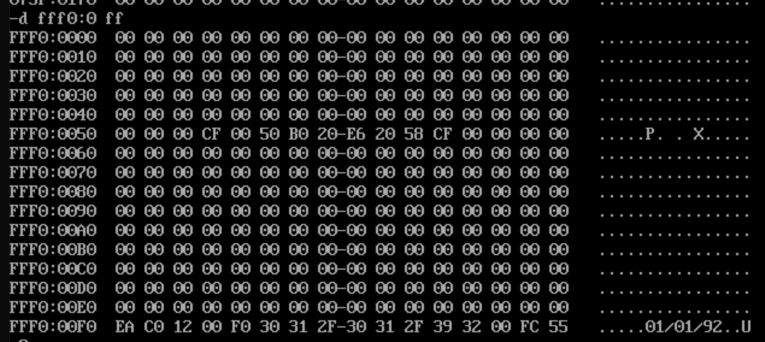 PC机主板上的ROM中有一个生产时期,在内存FFF00H ~ FFFFFH的某几个单元中,请找到这个生产时期,并试图修改它。