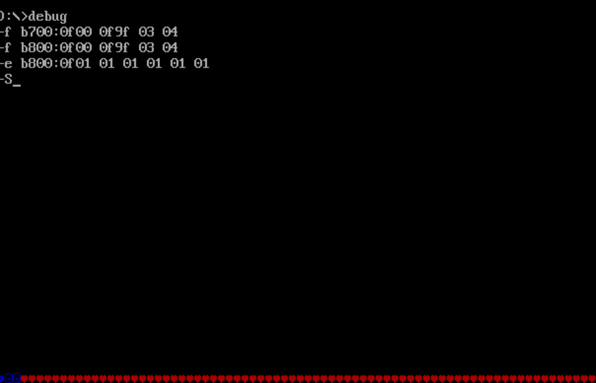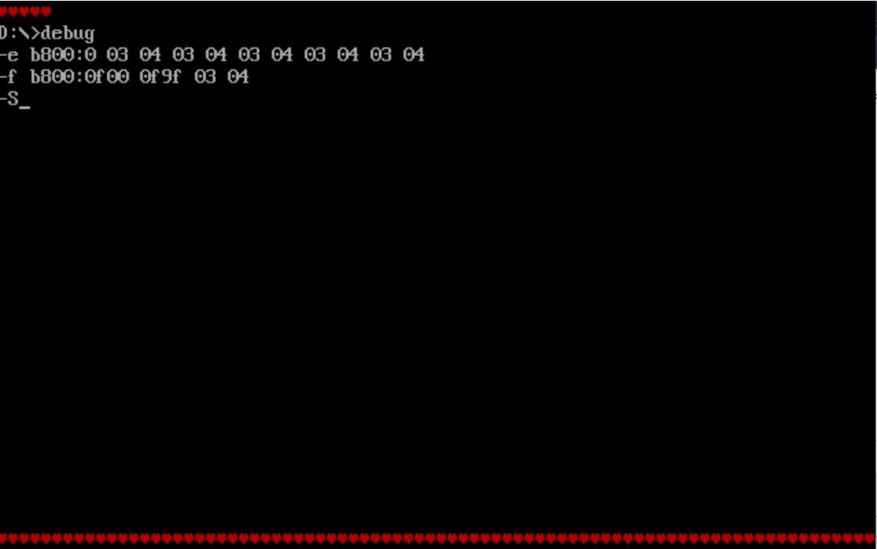 把内存单元区间b800:0f00 ~ b800:0f9f连续160个字节,依次重复填充十六进制数据03 04。