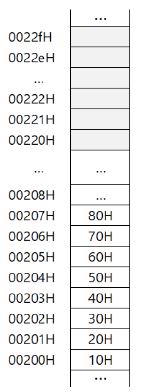 已知内存单元00201H ~ 00207H分别存放数据(如下图所示),00220H ~ 0022fH用作栈空间。