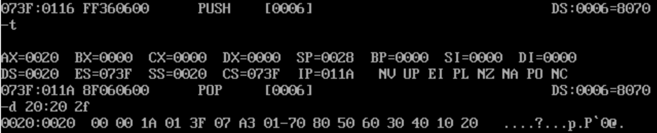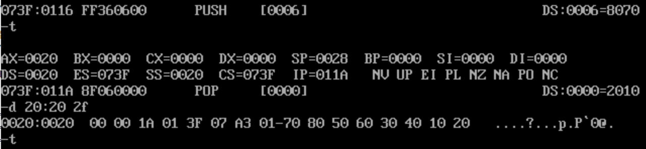 问题4:如果把最后四条指令改成截图中的顺序, pop [6] 指令执行结束后,使用d命令 d 20:0 7查看此时数据空间内的数据是否有变化。给出实验截图。