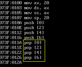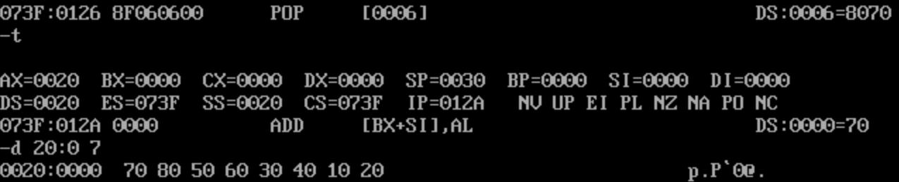 问题3:汇编指令 pop [0] 执行结束后, pop [0] 指令执行结束后,使用d命令 d 20:0 7 查看此时数据空间内的数据是否有变化。给出实验截图。