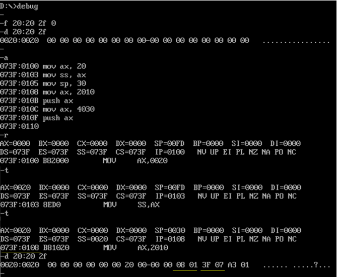 问题2:根据汇编指令,前三条指令执行后,00220H ~ 0022fH被设置为栈空间。并且,初始时,已通过f命令将初始栈空间全部填充为0。观察单步调试时,栈空间00220H ~ 0022fH内存单元值的变化,特别是图示中黄色下划线表示出的数据值。根据实验观察,尝试思考和分析原因。