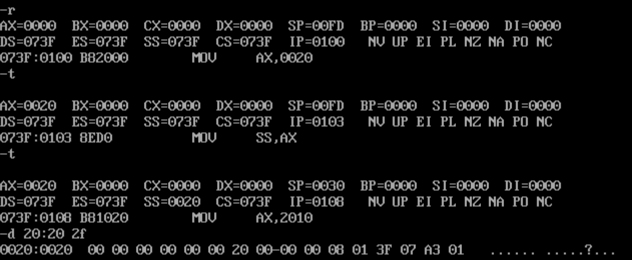 先使用f命令,把00220H ~ 0022fH区间的16个字节内存单元值全部修改为0。并使用d命令查看确认。然后,使用a命令、r命令、t命令写入汇编指令并单步调试。