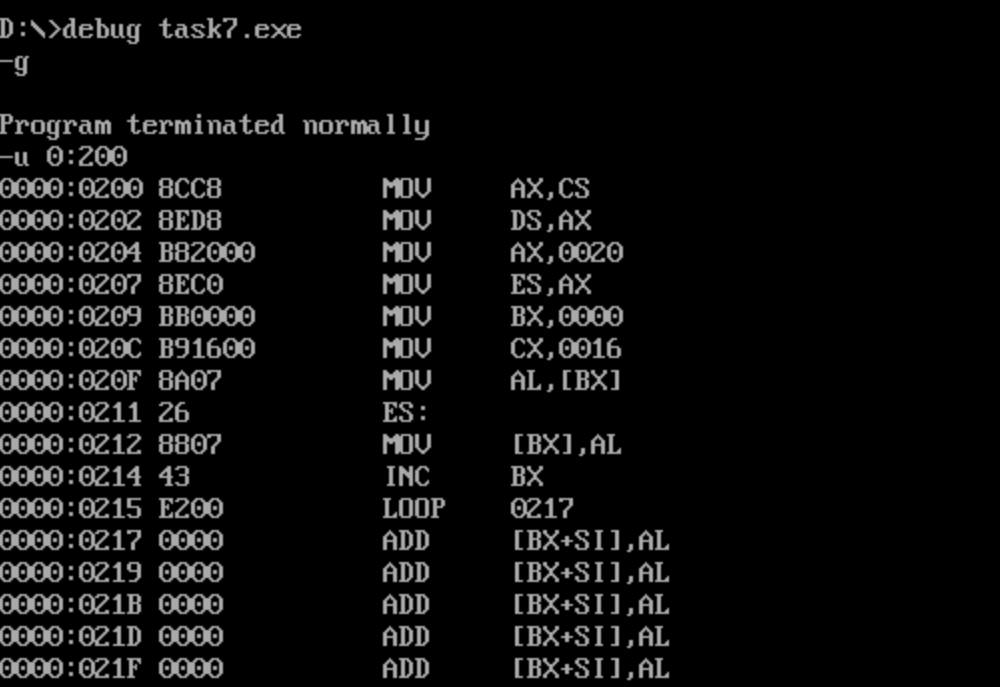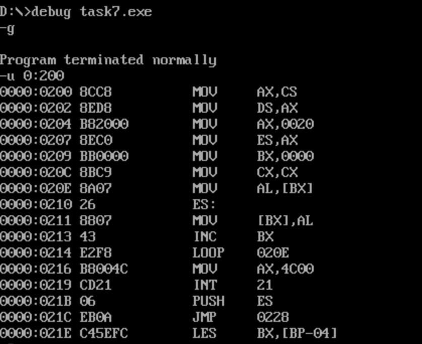 在debug中调试,使用g命令将程序执行到 loop s 之后、 mov ax, 4c00h 之前,然后,使用u命令对0:200开始的内存单元反汇编,确认是否把task7.asm中line3-line12的代码复制到了目标内存空间。
