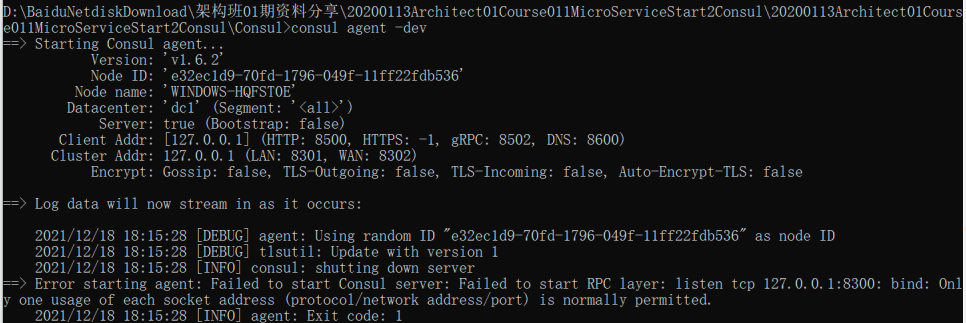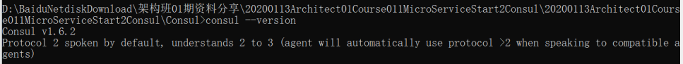 下载完成解压后你会得到一个consul.exe文件。在该目录下打开命令行,输入: