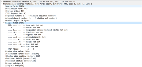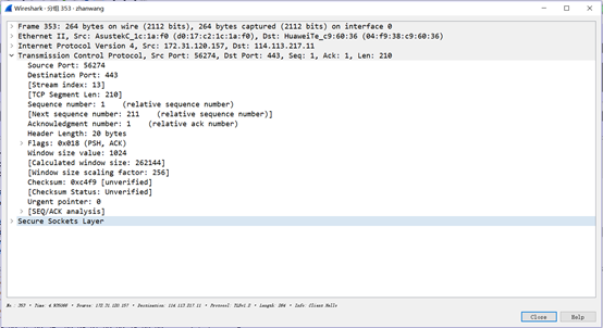 端口是传输层与应用层的服务接口。用于标示和区分源端设备和目的端设备的应用进程。此次抓包的结果为源端口(source port:56274)目的端口(destination port:443)
