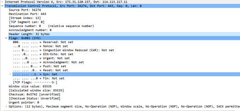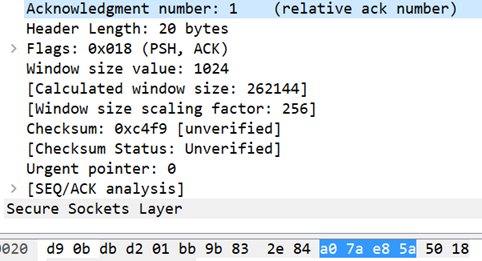 Sequence Number这个是发送序列号,用来标识从源端向目的端发送的数据字节流,它表示在这个报文端中的第一个数据字节的顺序号,序列号是32位的无符号类型,序列号表达达到2^32 - 1后又从0开始,当建立一个新的连接时,SYN标志为1,系列号将由主机随机选择一个顺序号ISN(Initial Sequence Number)。此报文中的序列号是1.
