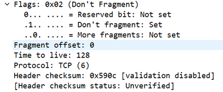 首部校验和(Header checksum):计算IP头部的校验和,检查IP报头的完整性。这里无法校验。【Header checksum: 0x590c [validation disabled]】