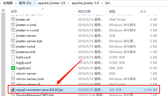 2、解压后将文件:mysql-connector-java-8.0.22.jar放到jemter安装目录的bin文件目录下