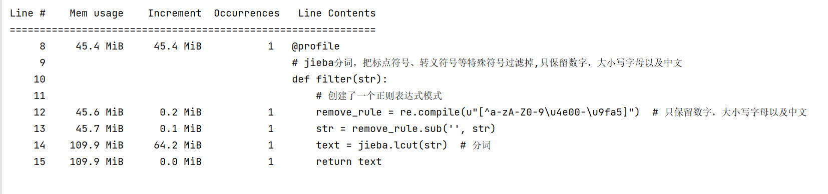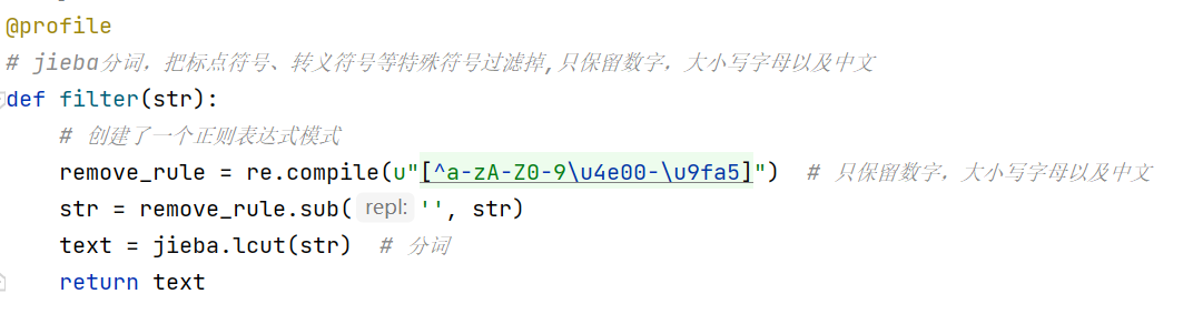 - 创建filter函数将读取到的文件内容先把标点符号、转义符号等特殊符号过滤掉,然后进行jieba分词