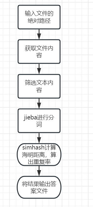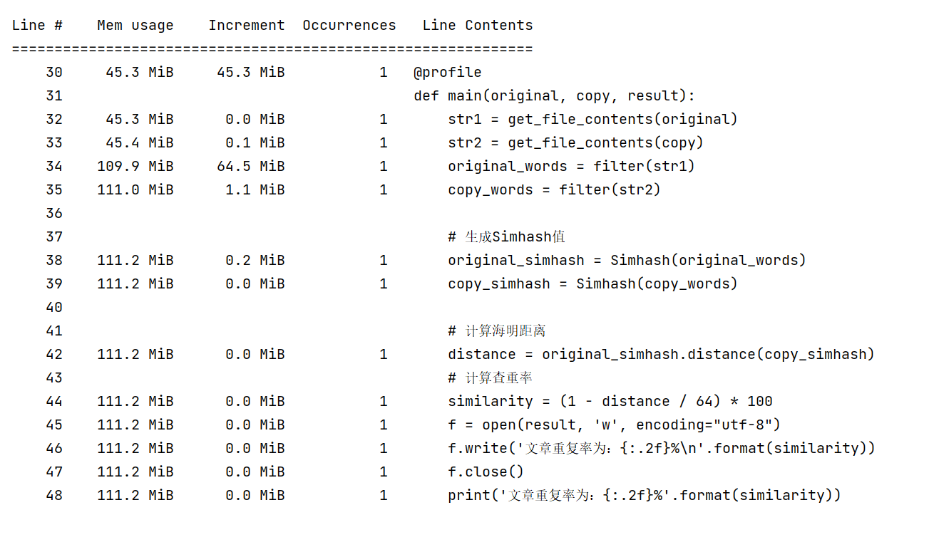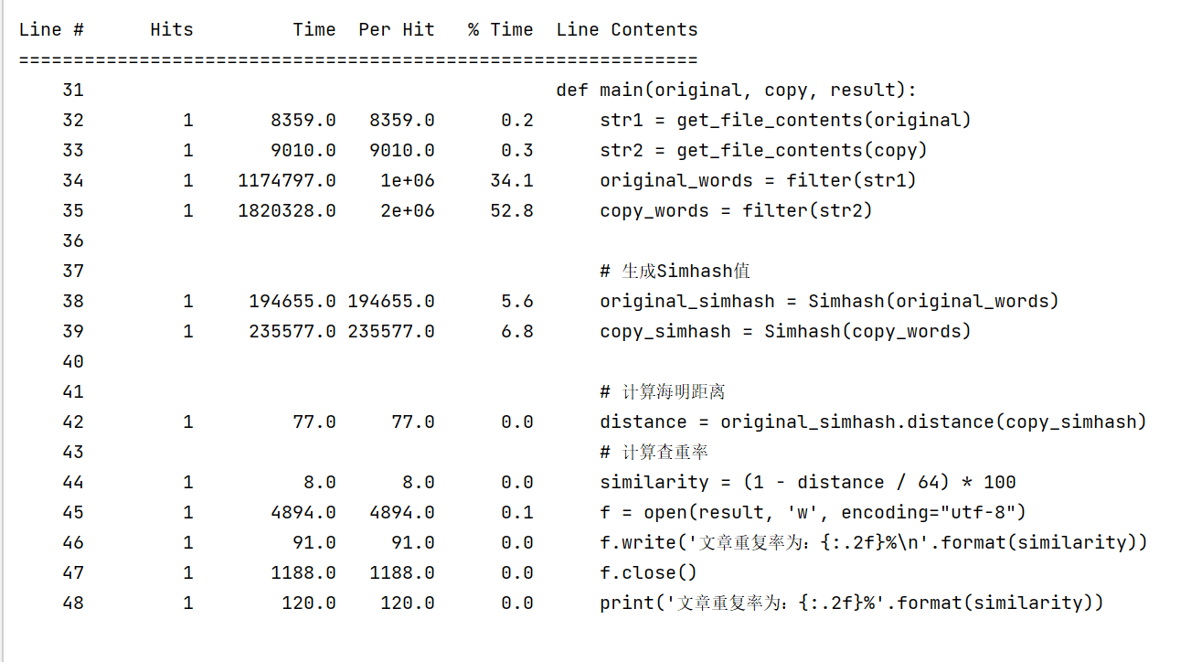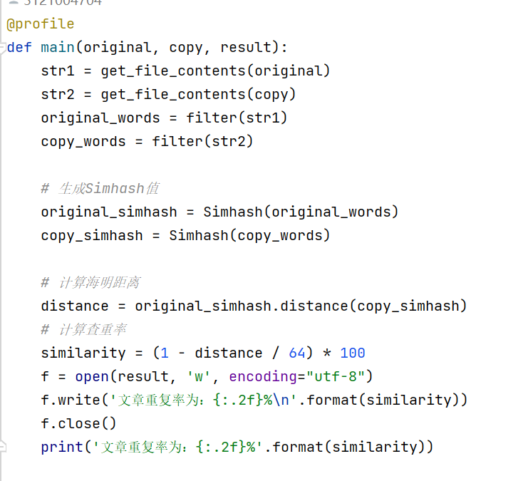 - 创建main函数用simhash库生成获取到的文本的Simhash值,计算海明距离,计算重复率,写入输出文件
