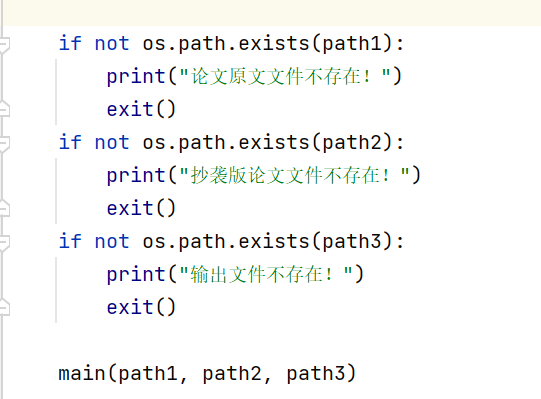 - 在调试阶段,针对使用者方便查重,设置输入文件路径,也防止文件路径出错问题。程序引入os.path.exists()方法用于检验文件是否存在,对文件路径进行判断,如果文件路径不存在,则退出程序。