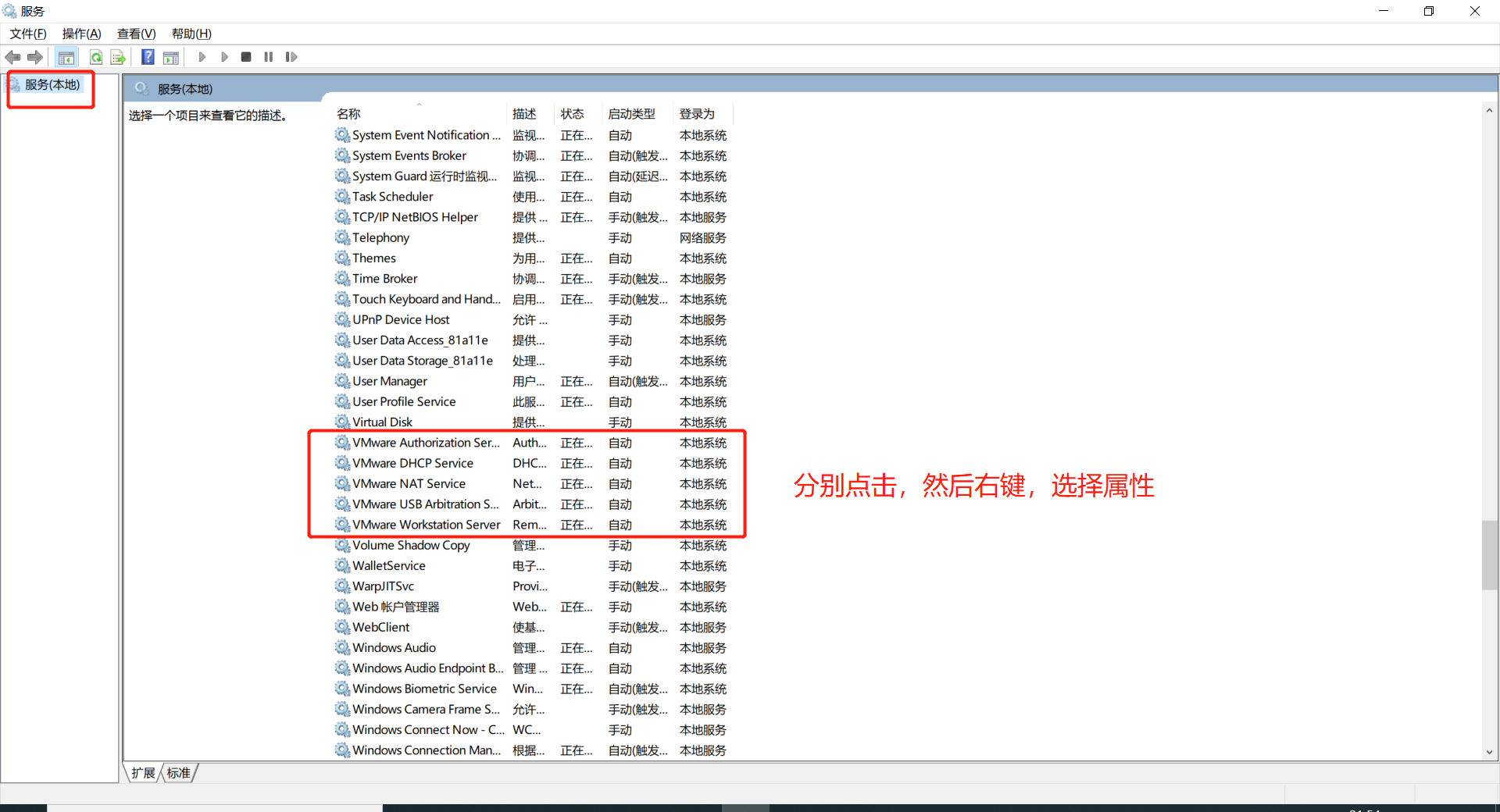 划重点!!在把5个服务禁用停止运行后,且把进程都关了之后,重启重启重启!!不要手动关机开机,直接重启!重启电脑开机之后,不要马上把服务启用(把禁用改为自动即可)(马上启用的话还是会显示老问题,会显示虚拟机正在运行,开不了机),过个十来二十分钟再去启用服务且启用完了之后把5个服务都运行起来,记住是5个服务都运行,就单机服务,左边会有启动按钮。
