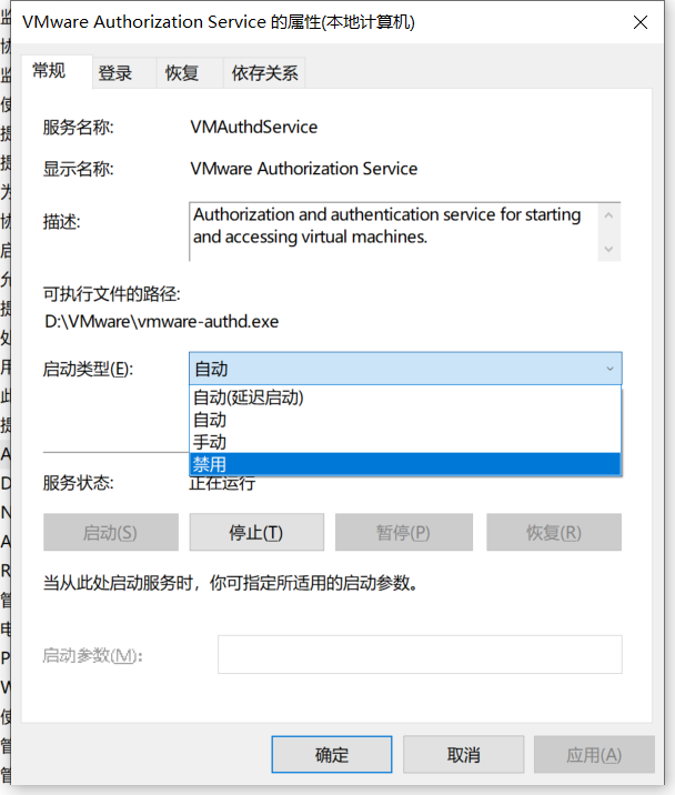 2、进入服务,找到跟VMware有关的所有服务,单机,右键,选择属性,在启动类型里面选择禁用,然后应用,再确定。5个与vmware有关的服务皆按此操作进行,全部禁用,且停止运行。