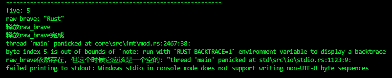 fn create_raw_pointer_use_box() { //回忆下Box指针,我们知道Box指针是一个堆上分配的智能指针。 let boxed = Box::new(5); let five = *boxed; println!("five: {}", five); let brave = Box::new(String::from("Rust")); let raw_brave = Box::into_raw(brave); unsafe{ println!("raw_brave: {:?}", *raw_brave); } //现在需要手动释放内存,否则会造成内存泄露 println!("释放raw_brave"); unsafe{ drop(Box::from_raw(raw_brave)); } println!("释放raw_brave完成"); // 以下代码需要注释掉,否则后续的代码不会执行。因为原始指针指向的内存地址是不合法的,可能会引发运行时错误。 // 很可惜,就是使用panic::catch_unwind,页无法阻止程序退出 // 虽然它会提示 thread 'main' panicked at std\src\io\stdio.rs:1123:9 unsafe{ let result = panic::catch_unwind(|| { println!("raw_brave依然存在,但这个时候它应该是一个空的: {:?}", *raw_brave); }); match result { Ok(_) => println!("一切正常"), Err(_) => println!("在访问有问题的原始指针后,程序出问题了"), } println!("--------------------- 继续运行 ----------------------- "); } }