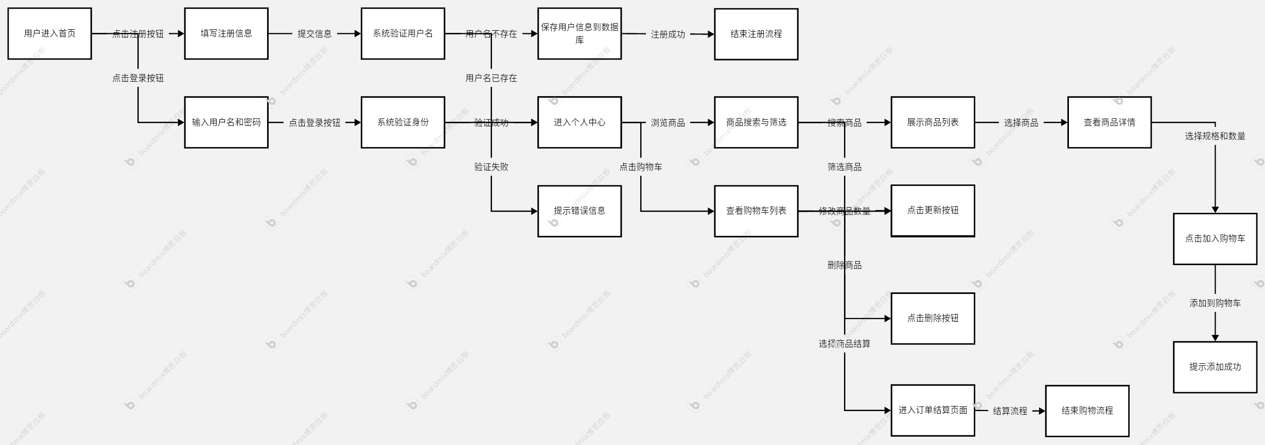 注册:新用户进入在线购物系统首页,点击 “注册” 按钮。填写用户名、密码、手机号码、电子邮箱等信息,阅读并同意用户协议,点击 “注册” 提交信息。系统验证用户名是否已存在,若不存在,将用户信息保存到数据库,注册成功