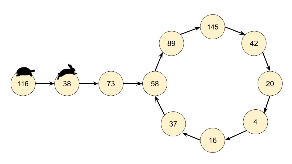 可以将每个平方和视为一个结点,初始状态下慢指针指向原始数 n,快指针指向该数的平方和 getSumOfSquares(n) ,然后慢指针每次移动一步:getSumOfSquares(slow) ,快指针每次移动两步:getSumOfSquares(getSumOfSquares(fast)) ,如果存在循环,两个指针最终会相遇。