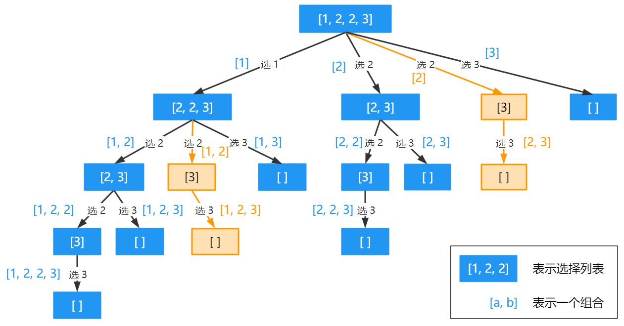 和上一个问题的不同之处在于,这里需要加上剪枝条件。递归树如下图所示,其中橙色的是重复分支,需要剪除。这个剪枝条件是:当前位置和上一个位置的元素一样。