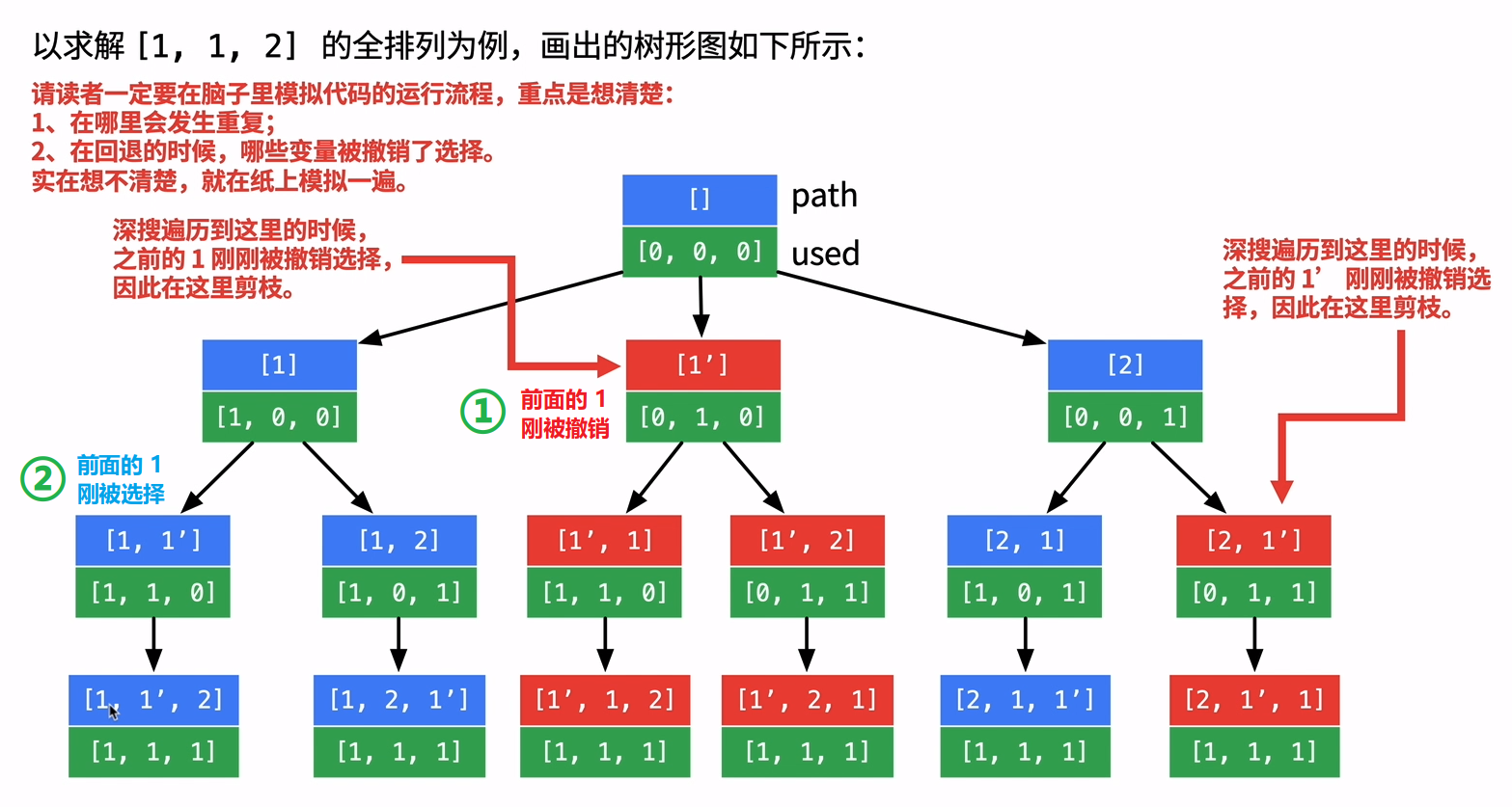 去重操作还可以使用(全局)used 数组来实现,这时剪枝条件为 i > 0 && nums[i] == nums[i - 1] && used[i - 1] == false 。(见 全排列 II 问题的解答)