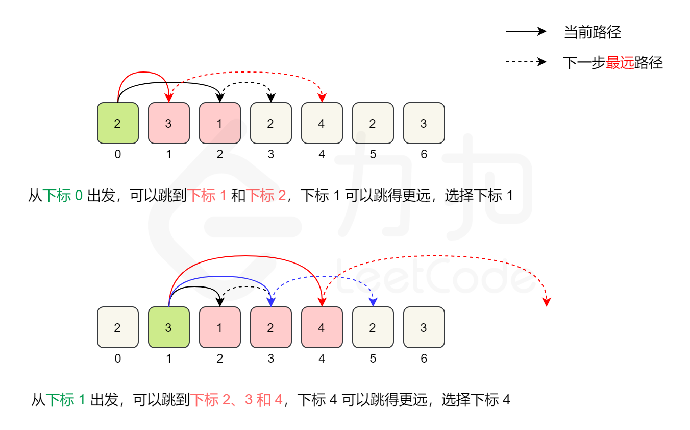 1可以进一步到达最远的位置,所以第一步先到达下标1,将它记为 边界。 - 然后继续遍历,不断记录当前能够到达的最远位置,到达边界位置时,更新下一个边界的位置,同时将跳跃步数加一。