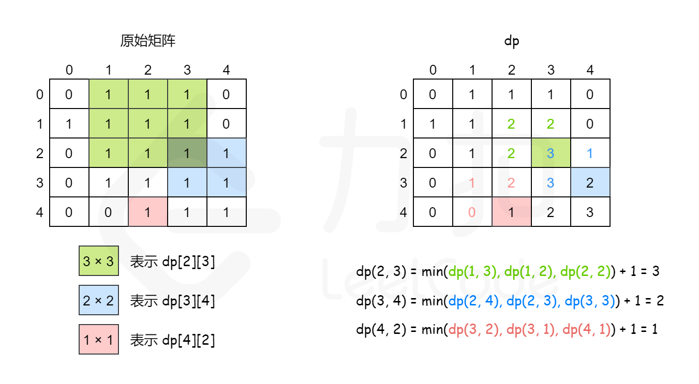 用 dp[i][j] 表示以 (i,j) 位置为右下角的最大正方形边长。每个位置的值取决于其左边、上边和左上边三个位置的值,状态转移方程为: