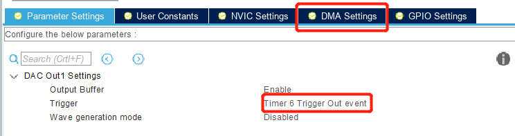 (2)配置DAC,比较简单,不多说,注意使能DMA: