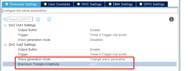 最大三角波幅(Maximum Triangle Amplitude)为4095,即为3.3V(参考电压为3.3V)