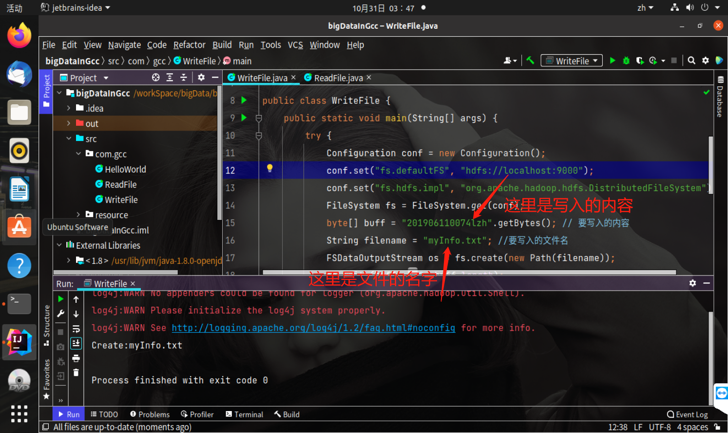 同样在idea创建一个类ReadFile,代码如下(注意代码中的文件路径需要和你WriteFile里面定义的文件路径一样):