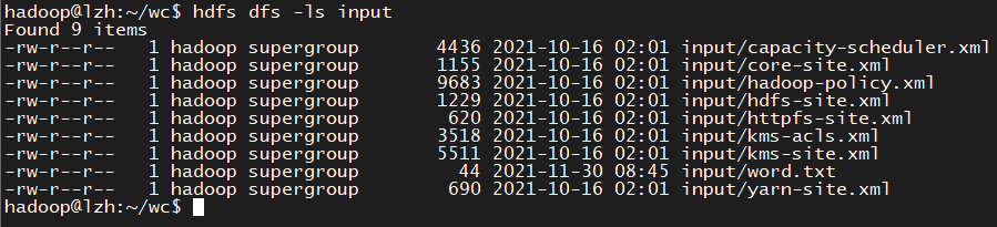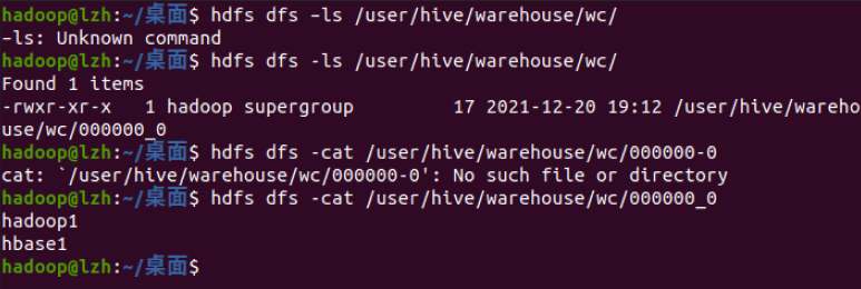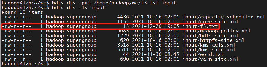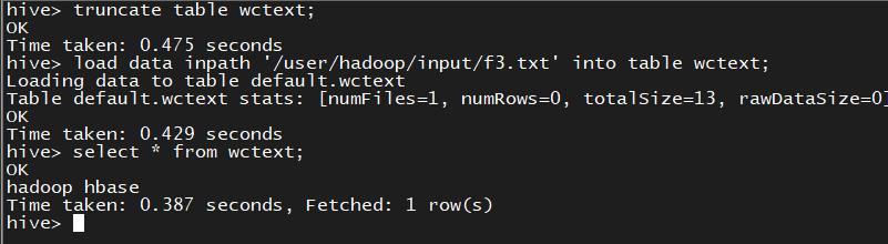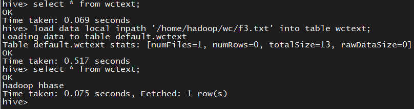 10.从hdfs导入文件内容到表wctext, 并查看hdfs源文件,hfds数据库文件