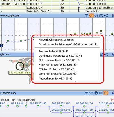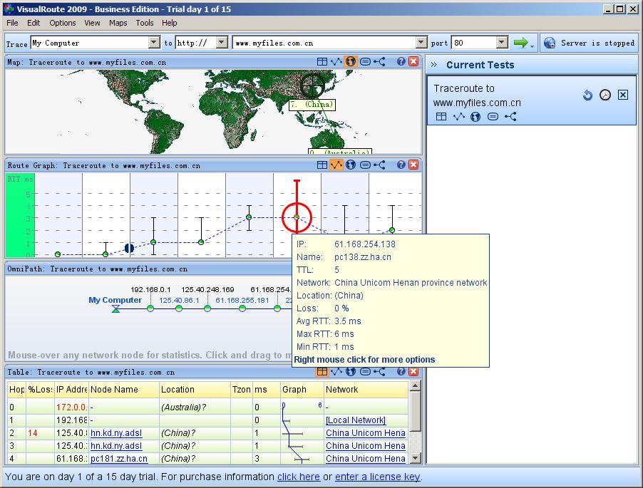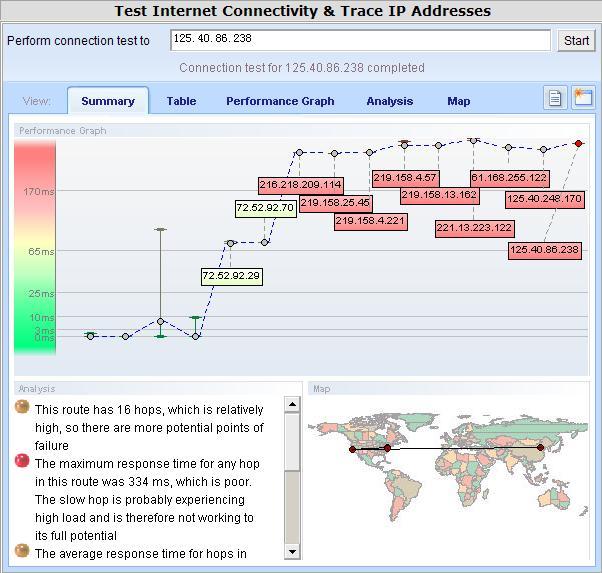 用户可以使用VisualRoute看到自己当前网络连接的即时性能分析,还可以检测ISP的响应速度;如果你访问某一网站速度过慢,通过VisualRoute你可以很快的发现导致访问故障的网络路径结点,并利用地图功能可形象展现出你所访问的Web服务器所在地址。