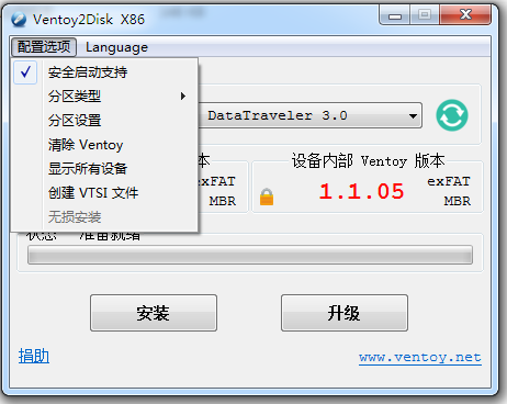 点击“安装”,如果是已有Ventoy的U盘,如果版本有更新,则点击“升级”按键,将Ventoy安装到U盘里。