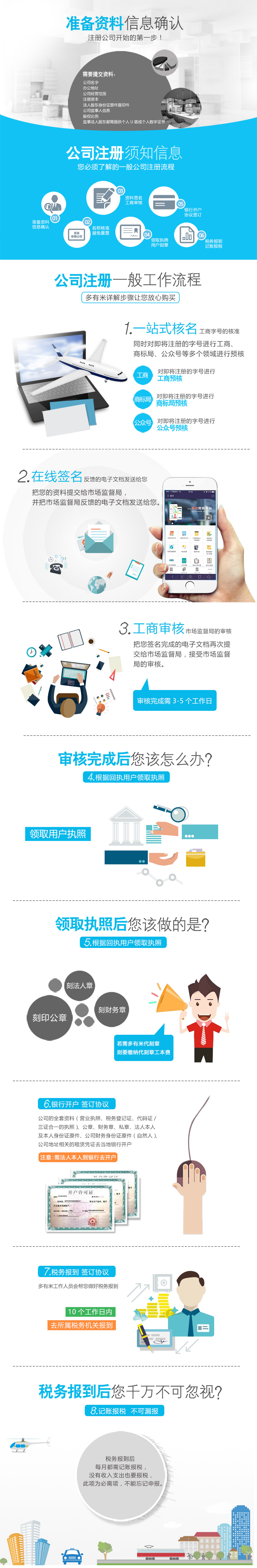 1.准备资料,信息确认 2.名称核准,避免重复 3.资料签名,工商审核 4.领取执照,用户刻章 5.银行开户,协议签订 6.税务报到,记账报税