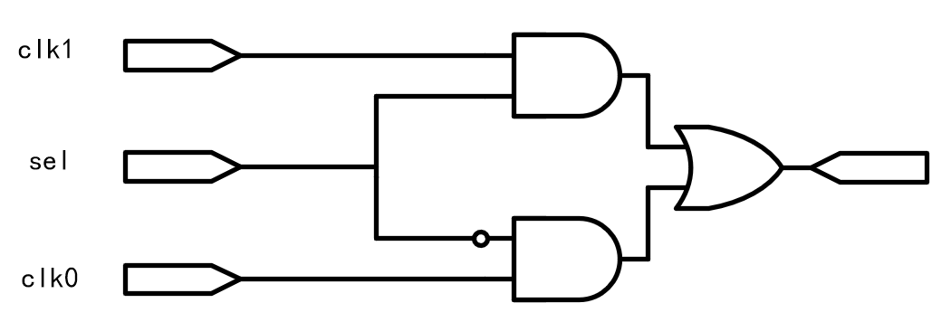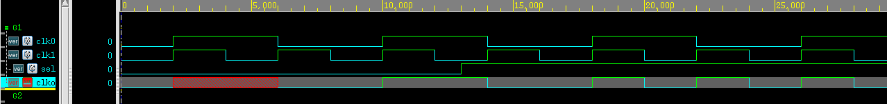 这种电路的缺点是会产生毛刺信号,如下图所示,当clk0处于高电平时sel从clk0切换到clk1就产生一个毛刺信号