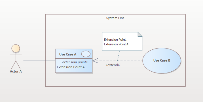 具有扩展模式的基本用例模型创建元素和一个用例图,描述用户角色希望从系统中实现的目标。 用例都包含在系统边界内,参与者都位于边界之外。 扩展关系允许在指定的点上通过在另一个用例中定义的交互来增强用例。