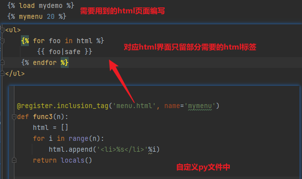 {% load mydemo %} # 需要先加载自己创建的py文件名