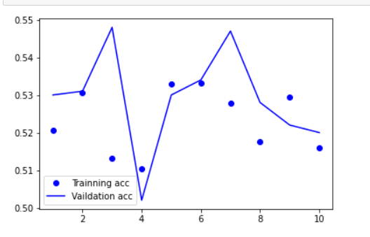 plt.plot(epochs, acc, 'bo', label='Trainning acc') # 以epochs为横坐标,以训练集准确性为纵坐标