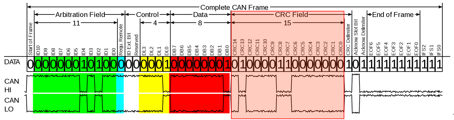 另外,数据帧和遥控帧有标准格式和扩展格式两种格式。标准格式有 11 个位的标识符(ID),