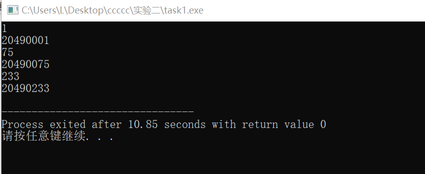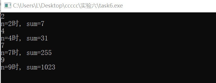 #include <math.h> #include <stdio.h> int main(){ int n,sum; while(1){ scanf("%d",&n); sum=1*(1-pow(2,(n+1)))/(1-2); printf("n=%d时, sum=%d\n",n,sum); } return 0; }