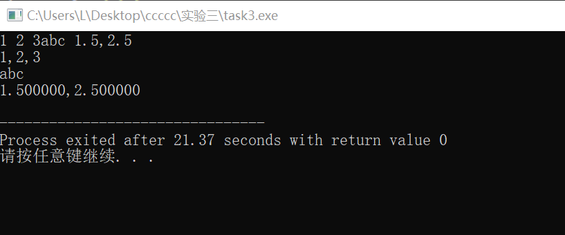 #include <stdio.h> int main(){ double x,y; char c1,c2,c3; int a1,a2,a3; scanf("%d%d%d",&a1,&a2,&a3); printf("%d,%d,%d\n",a1,a2,a3); scanf("%c%c%c",&c1,&c2,&c3); printf("%c%c%c\n",c1,c2,c3); scanf("%lf,%lf",&x,&y); printf("%lf,%lf\n",x,y); return 0; }