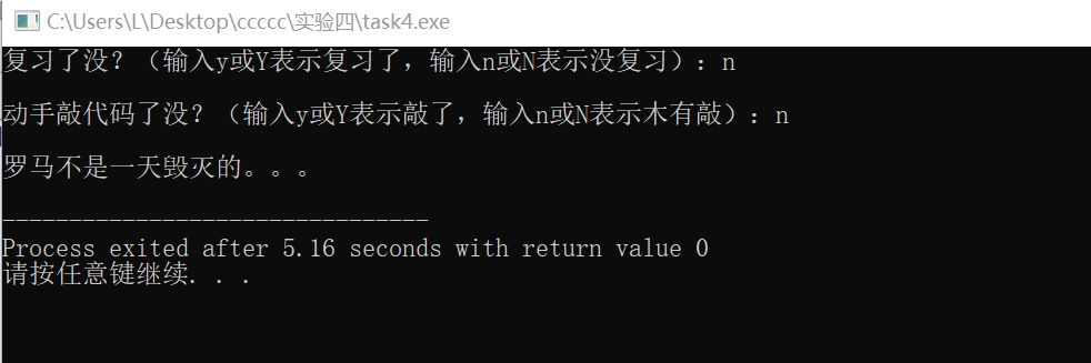 #include <stdio.h> int main(){ char ans1,ans2; printf("复习了没?(输入y或Y表示复习了,输入n或N表示没复习):"); ans1=getchar(); getchar(); printf("\n动手敲代码了没?(输入y或Y表示敲了,输入n或N表示木有敲):"); ans2=getchar(); if(ans1=='y'&&ans2=='y'||ans1=='Y'&&ans2=='Y'||ans1=='y'&&ans2=='Y'||ans1=='Y'&&ans2=='y') printf("\n罗马不是一天建成的:)\n"); else printf("\n罗马不是一天毁灭的。。。\n"); return 0; }