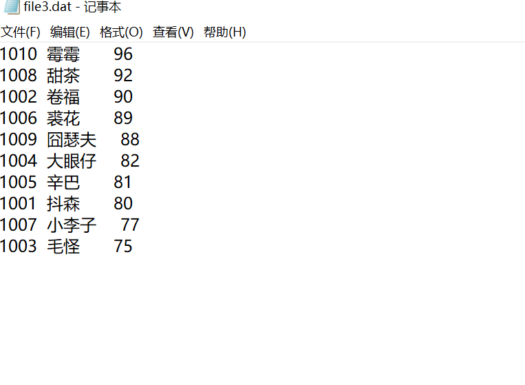 // 从文本数据文件file1.dat中读入数据,按成绩从高到低排序,将排序结果输出到屏幕上,同时以文本方式存入文件file3.dat中。 #include <stdio.h> #include <stdlib.h> #define N 10 // 定义一个结构体类型STU typedef struct student { int num; char name[20]; int score; }STU; void sort(STU *pst, int n); // 函数声明 int main() { FILE *fin, *fout; STU st[N]; int i; // 以只读文本方式打开文件file1.dat fin = fopen("file1.dat", "r"); if( !fin ) { // 如果打开失败,则输出错误提示信息,然后退出程序 printf("fail to open file1.dat\n"); exit(0); } // 从fin指向的数据文件file1.dat中读取数据到结构体数组st for(i=0; i<N; i++) fscanf(fin, "%d %s %d", &st[i].num, st[i].name, &st[i].score); fclose(fin); // 关闭fin指向的文件file1.dat // 调用函数sort()对数组st中数据,按分数由高到低排序 sort(st, N); // 以写方式打开/创建文本文件file3.dat fout = fopen("file3.dat", "w"); if( !fout ) { // 如果打开失败,则输出错误提示信息,然后退出程序 printf("fail to open file1.dat\n"); exit(0); } // 将排序后的数组st中数据输出到屏幕,同时,也写入文件file3.dat for(i=0; i<N; i++) { printf("%-6d%-10s%3d\n", st[i].num, st[i].name, st[i].score); fprintf(fout, "%-6d%-10s%3d\n", st[i].num, st[i].name, st[i].score); } fclose(fout); // 关闭fout指向的文件file3.dat return 0; } // 函数功能描述:对pst指向的n个STU结构体数据进行排序,按成绩数据项由高到底排序 // 排序算法:选择排序算法 // 说明:选择排序算法是确定的,但其具体实现方式和细节却是灵活多样的 // 本例中,选择排序算法的函数体中,都是通过指针变量操作的。 // 请结合代码体会和理解,做到理解算法本质,才能应对和理解灵活多样的实现形式 void sort(STU *pst, int n) { STU *pi, *pj, t; for(pi = pst; pi < pst+n-1; pi++) for(pj = pi+1; pj < pst+n; pj++) if(pi->score < pj->score) { t = *pi; *pi = *pj; *pj = t; } }
