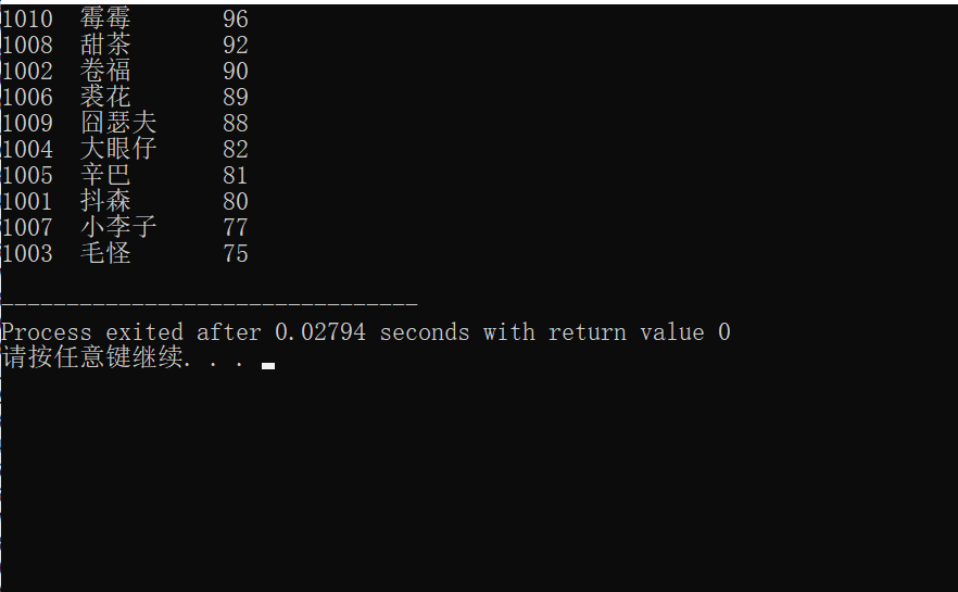 // 从文本数据文件file1.dat中读入数据,按成绩从高到低排序,并将排序结果输出到屏幕上,同时,也以二进制方式存入文件file4.dat中。 #include <stdio.h> #include <stdlib.h> #define N 10 // 定义一个结构体类型STU typedef struct student { int num; char name[20]; int score; }STU; void sort(STU *pst, int n); // 函数声明 int main() { FILE *fin, *fout; STU st[N]; int i; // 以只读文本方式打开文件file1.dat fin = fopen("file1.dat", "r"); if( !fin ) { // 如果打开失败,则输出错误提示信息,然后退出程序 printf("fail to open file1.dat\n"); exit(0); } // 从fin指向的数据文件file1.dat中读取数据到结构体数组st for(i=0; i<N; i++) fscanf(fin, "%d %s %d", &st[i].num, st[i].name, &st[i].score); fclose(fin); // 关闭fin指向的文件file1.dat // 调用函数sort()对数组st中数据,按分数由高到低排序 sort(st, N); // 以写方式打开/创建二进制文件file4.dat fout = fopen("file4.dat", "wb"); if( !fout ) { // 如果打开失败,则输出错误提示信息,然后退出程序 printf("fail to open file1.dat\n"); exit(0); } // 将排序后的数组st中数据输出到屏幕 for(i=0; i<N; i++) printf("%-6d%-10s%3d\n", st[i].num, st[i].name, st[i].score); // 将排序后的数组st中数据写到二进制文件file4.dat fwrite(st, sizeof(STU), N, fout); // 将从地址st开始的sizeof(STU)×N个字节信息写入fout指向的文件file4.dat中 fclose(fout); // 关闭fout指向的文件file4.dat return 0; } // 函数功能描述:对pst指向的n个STU结构体数据进行排序,按成绩数据项由高到底排序 // 排序算法:选择排序算法 void sort(STU *pst, int n) { STU *pi, *pj, t; for(pi = pst; pi < pst+n-1; pi++) for(pj = pi+1; pj < pst+n; pj++) if(pi->score < pj->score) { t = *pi; *pi = *pj; *pj = t; } }
