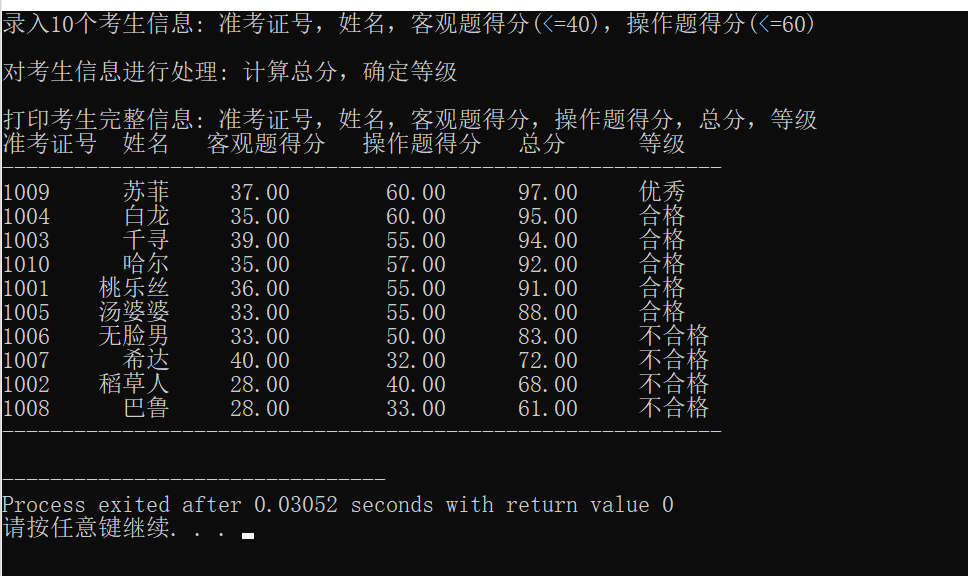 #include <stdio.h> #include <string.h> const int N = 10; // 定义结构体类型struct student,并定义其别名为STU typedef struct student { long int id; char name[20]; float objective; /*客观题得分*/ float subjective; /*操作题得分*/ float sum; char level[10]; }STU; // 函数声明 void input(STU s[], int n); void output(STU s[], int n); void process(STU s[], int n); int main() { STU stu[N]; printf("录入%d个考生信息: 准考证号,姓名,客观题得分(<=40),操作题得分(<=60)\n", N); input(stu, N); printf("\n对考生信息进行处理: 计算总分,确定等级\n"); process(stu, N); printf("\n打印考生完整信息: 准考证号,姓名,客观题得分,操作题得分,总分,等级\n"); output(stu, N); return 0; } // 从文本文件examinee.txt读入考生信息:准考证号,姓名,客观题得分,操作题得分 void input(STU s[], int n) { FILE*fin; int i; fin = fopen("examinee.txt", "r"); // 以只读文本方式打开文件file1.txt if (fin == NULL) { printf("fail to open file1.txt\n"); }else for(i=0; i<N; i++) { fscanf(fin, "%d %s %f %f", &s[i].id, s[i].name, &s[i].objective,&s[i].subjective); } // 补足代码 // ××× } // 输出考生完整信息: 准考证号,姓名,客观题得分,操作题得分,总分,等级 // 不仅输出到屏幕上,还写到文本文件result.txt中 void output(STU s[], int n) { int i; printf("准考证号 姓名 客观题得分 操作题得分 总分 等级\n"); printf("------------------------------------------------------------\n"); for(i=0;i<n;i++) printf("%4ld %6s %5.2f %.2f %6.2f %4s\n", s[i].id, s[i].name, s[i].objective, s[i].subjective, s[i].sum, s[i].level); printf("------------------------------------------------------------\n"); // 补足代码 // ××× } // 对考生信息进行处理:计算总分,排序,确定等级 void process(STU s[], int n) { int i,j; for(i=0;i<n;i++) s[i].sum=s[i].objective+s[i].subjective; STU temp; for(i=0;i<n-1;i++) for(j=0;j<n-1-i;j++) if(s[j].sum<s[j+1].sum) { temp = s[j]; s[j] = s[j+1]; s[j+1] = temp; } for(i=0;i<n;i++) if(i==0) strcpy(s[i].level,"优秀"); else if(0<i&&i<6) strcpy(s[i].level,"合格"); else strcpy(s[i].level,"不合格"); // 补足代码 // ××× }